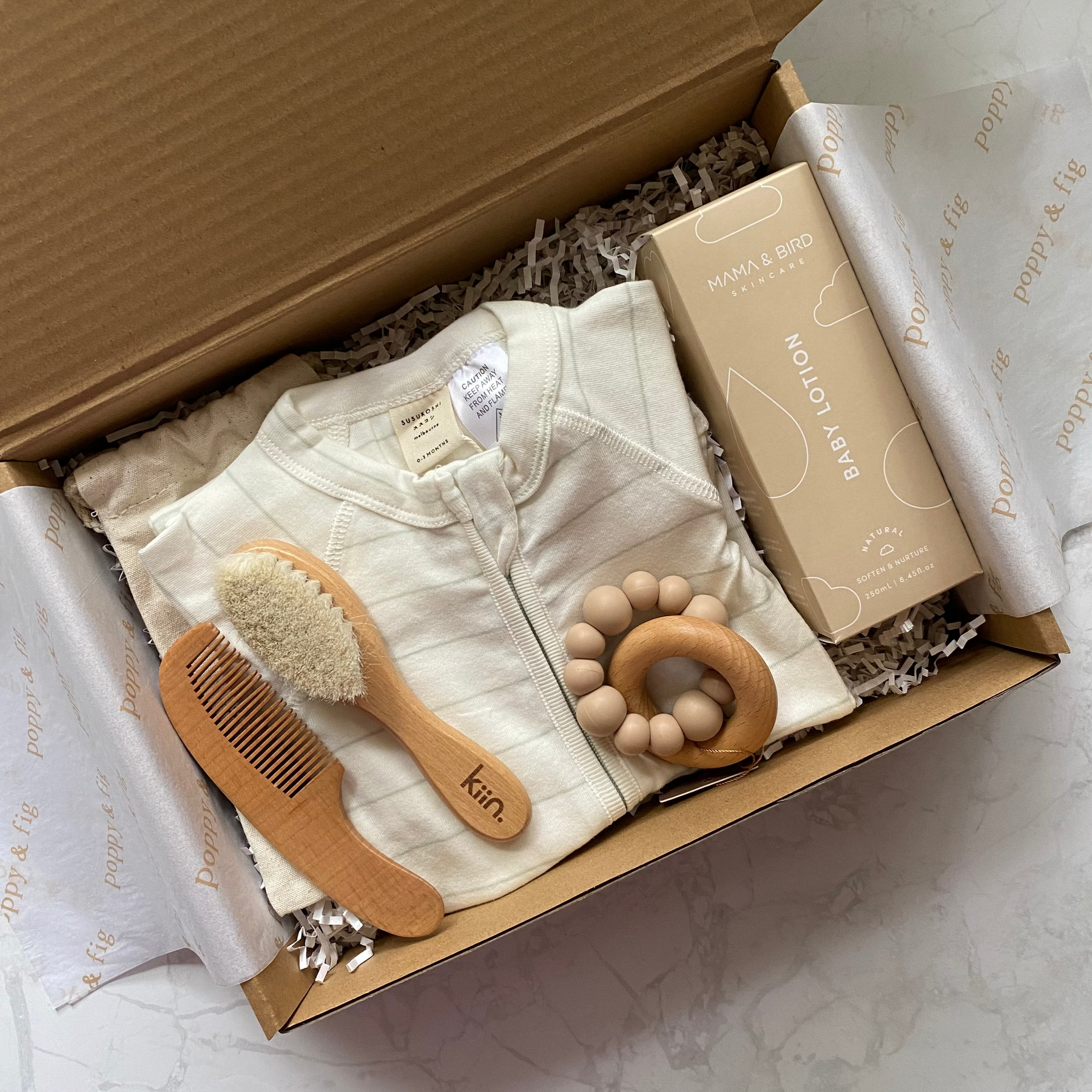 The Louis Baby Hamper is a delightful newborn baby gift set that includes a quality baby onesie, baby wash or lotion, brush set and teether. Perfect all round gift, this hamper is a thoughtful choice for new parents. All items are made with high-quality materials, ensuring maximum comfort for the baby.
